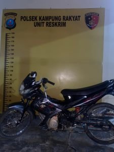 Barang bukti yang diamankan adalah 1 unit sepeda motor Satria FU BK 2161 YAO dan 1 bilah pisau bergagang besi. Pelaku dan barang bukti telah dibawa ke Polsek Kampung Rakyat untuk diproses sesuai prosedur hukum yang berlaku.(K.Nasution)