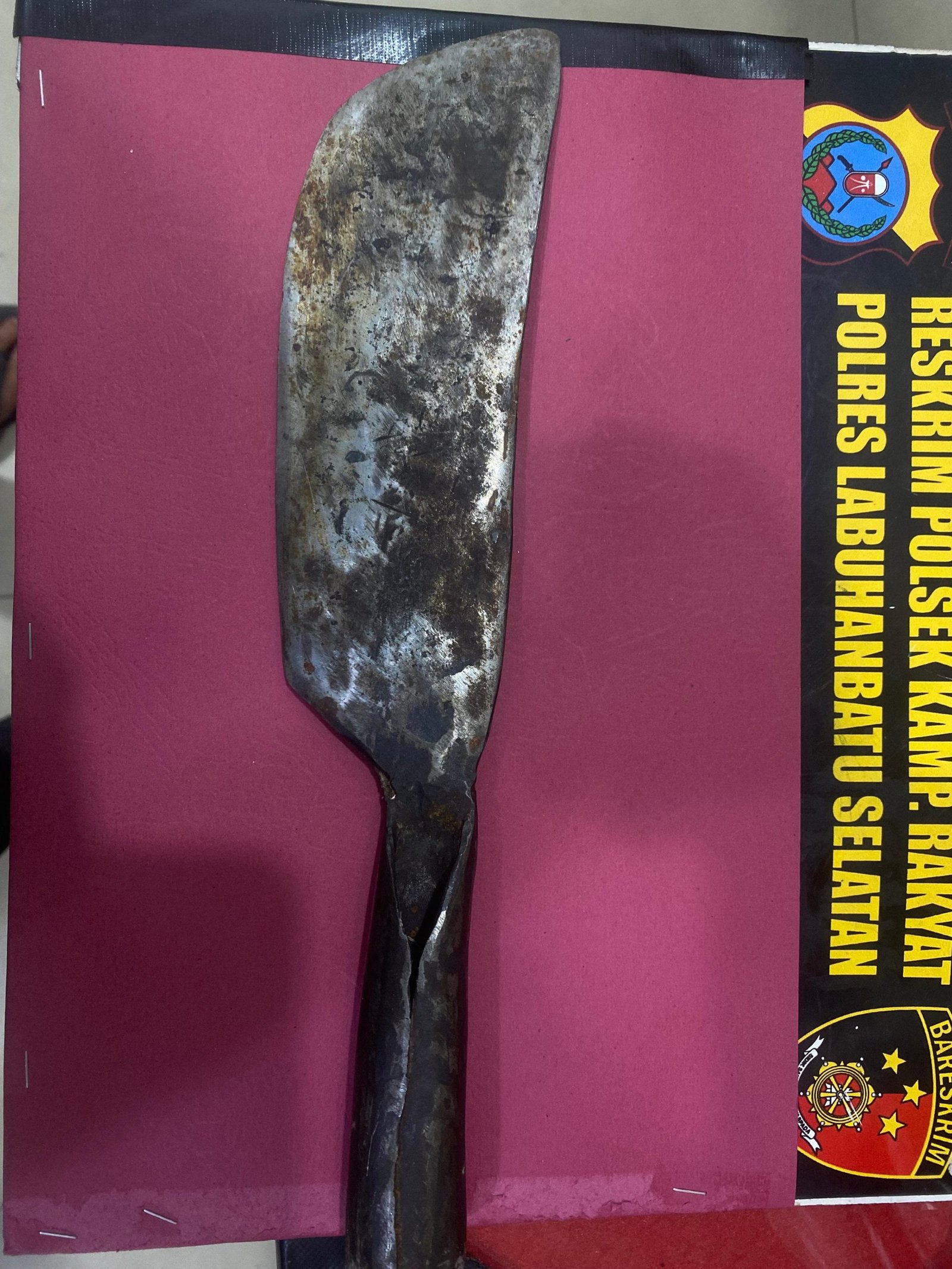 Barang bukti yang diamankan adalah 1 unit sepeda motor Satria FU BK 2161 YAO dan 1 bilah pisau bergagang besi. Pelaku dan barang bukti telah dibawa ke Polsek Kampung Rakyat untuk diproses sesuai prosedur hukum yang berlaku.(K.Nasution)