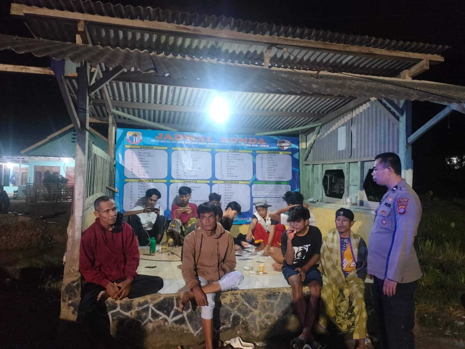 Lebak Benuanews.com Anggota Polsek Cimarga Polres Lebak Aipda Deni KW bersama Aipda Sandidede giat patroli dialogis dan sambangi warga masyarakat yang sedang ronda siskamling di Kampung Cidahu.
