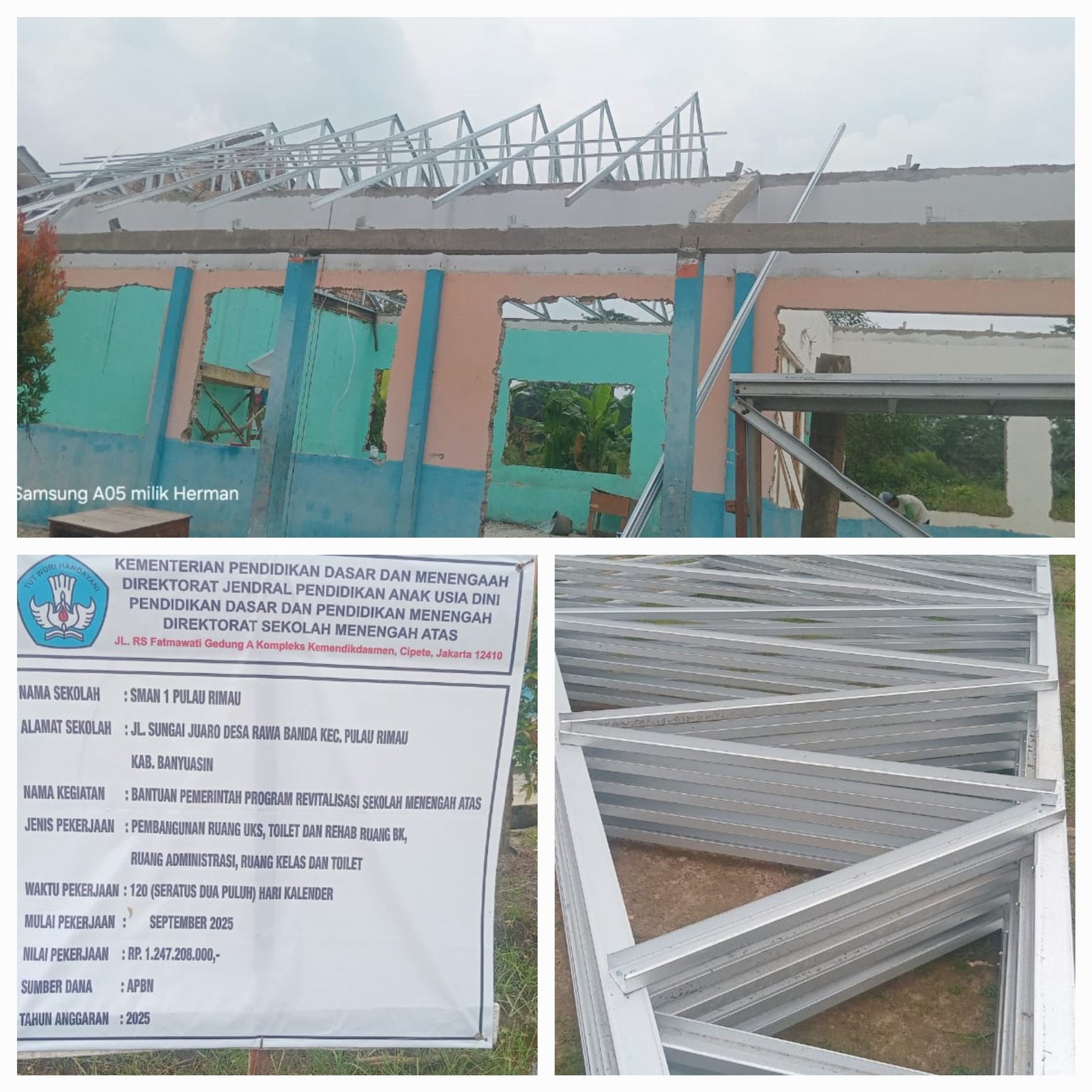 Banyuasin,Benua News.com – Papan informasi proyek di lingkungan SMAN 1 Pulau Rimau menunjukkan adanya kegiatan Bantuan Pemerintah Program Revitalisasi Sekolah Menengah Atas. Proyek ini meliputi pembangunan ruang UKS, toilet, rehabilitasi ruang BK, ruang administrasi, ruang kelas, hingga toilet, dengan anggaran fantastis mencapai Rp 1.247.208.000,- yang bersumber dari APBN Tahun Anggaran 2025. Waktu pengerjaan ditetapkan selama 120 hari kalender, mulai September 2025.
