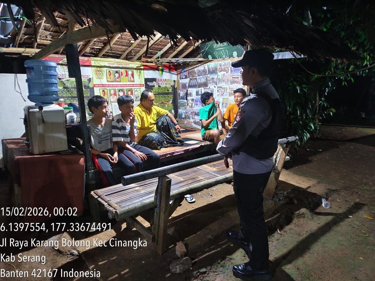 Cilegon Benuanews.com Personel Bhabinkamtibmas Polsek Cinangka melaksanakan Program Commander Wish Kapolda Banten RONDA SATKAMLING menjalin komunikasi dengan Petugas Siskamling agar berperan aktif dalam menciptakan Harkamtibmas yang aman dan Kondusif, Minggu (15/02/2026).