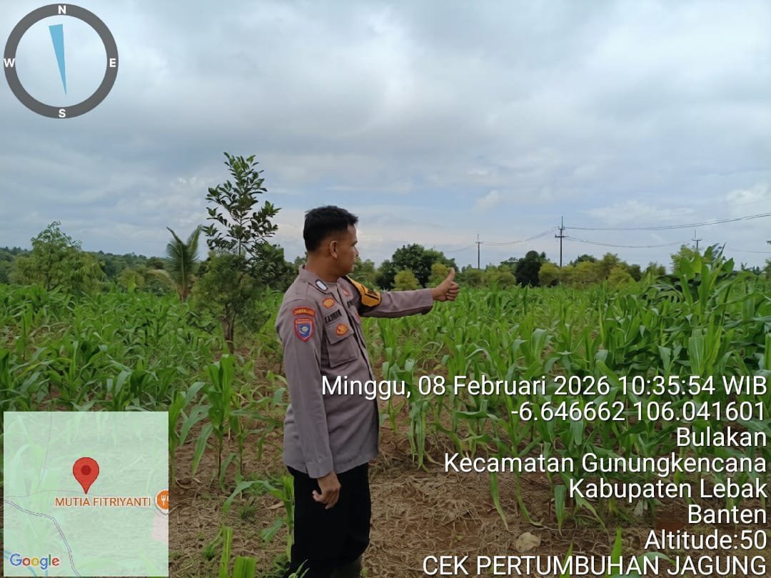 Lebak Benuanews.com Bhabinkamtibmas Polsek Gunungkencana Polres Lebak, Bripka Agus Muharram, melaksanakan kegiatan pengecekan lahan pertanian yang telah ditanami jagung hibrida di Kampung Sarongge, Desa Bulakan, Kecamatan Gunungkencana, Kabupaten Lebak, pada Minggu, 8 Februari 2026.