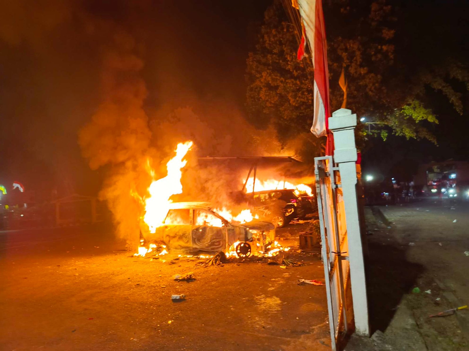 Insiden terjadi sekitar pukul 01.30 WIB. Massa menyerang dan membakar mobil dinas, namun hingga kini belum diketahui pasti berapa jumlah kendaraan yang ikut terbakar.
