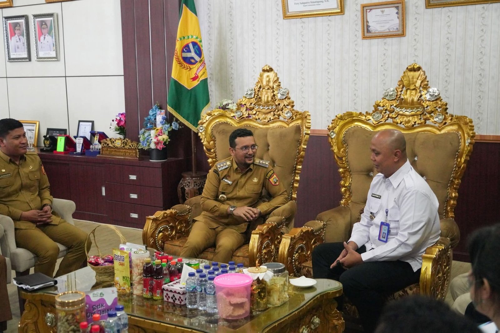 Bupati Labuhanbatu Selatan menerima kunjungan silaturahmi Kepala Badan Narkotika Nasional Kabupaten (BNNK) Labuhanbatu Utara, Karno Adhi Swasono, beserta jajaran di ruang kerjanya,Desa Sosopan, Kecamatan Kotapinang, Kabupaten Labuhanbatu Selatan, Sumatera Utara Senin (20/10-2025)