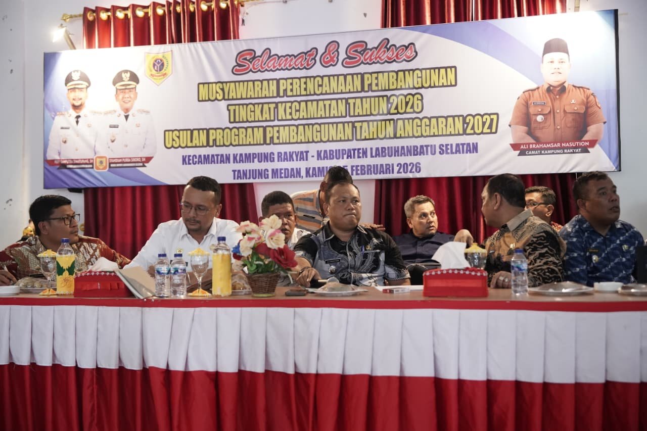 Bupati Labuhanbatu Selatan Fery Sahputra Simatupang membuka Musyawarah Perencanaan Pembangunan (Musrenbang) Kecamatan Kampung Rakyat di Aula Kantor Camat Kampung Rakyat, Kamis, 5 Februari 2026. Forum ini menjadi wadah penyelarasan antara usulan masyarakat desa dan arah kebijakan pembangunan daerah.