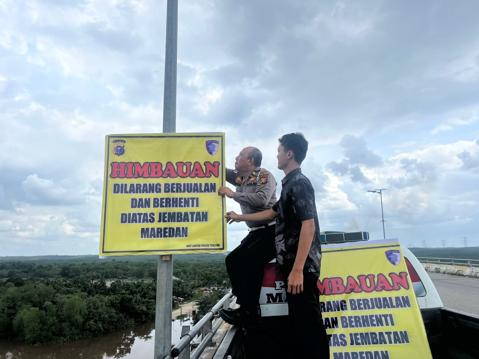 “Pemasangan spanduk larangan berhenti dan berjualan di Jembatan Maredan ini bertujuan untuk mengantisipasi terjadinya kecelakaan lalu lintas serta kemacetan, khususnya pasca pelaksanaan Operasi Lilin LK 2025. Kami mengimbau masyarakat agar mematuhi imbauan ini demi keselamatan bersama,” tegas Kompol Teguh Wiyono.