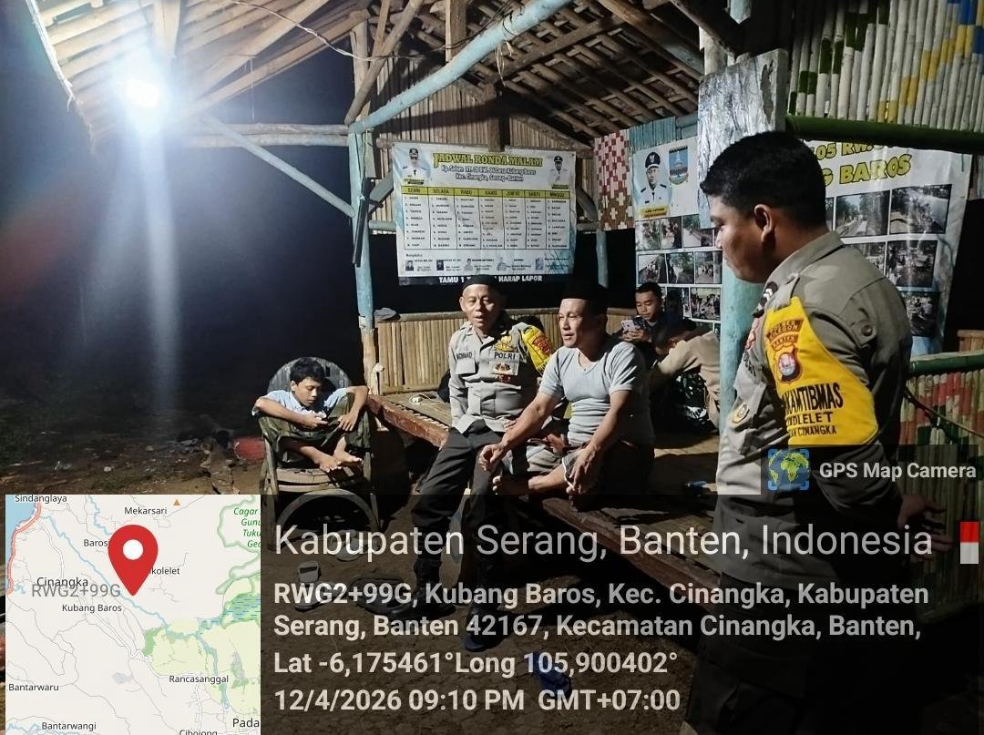 Cilegon Benuanews.com || Personel Bhabinkamtibmas Polsek Cinangka melaksanakan Program Commander Wish Kapolda Banten RONDA SATKAMLING menjalin komunikasi dengan Petugas Siskamling agar berperan aktif dalam menciptakan Harkamtibmas yang aman dan Kondusif, Senin (13/10/2025).