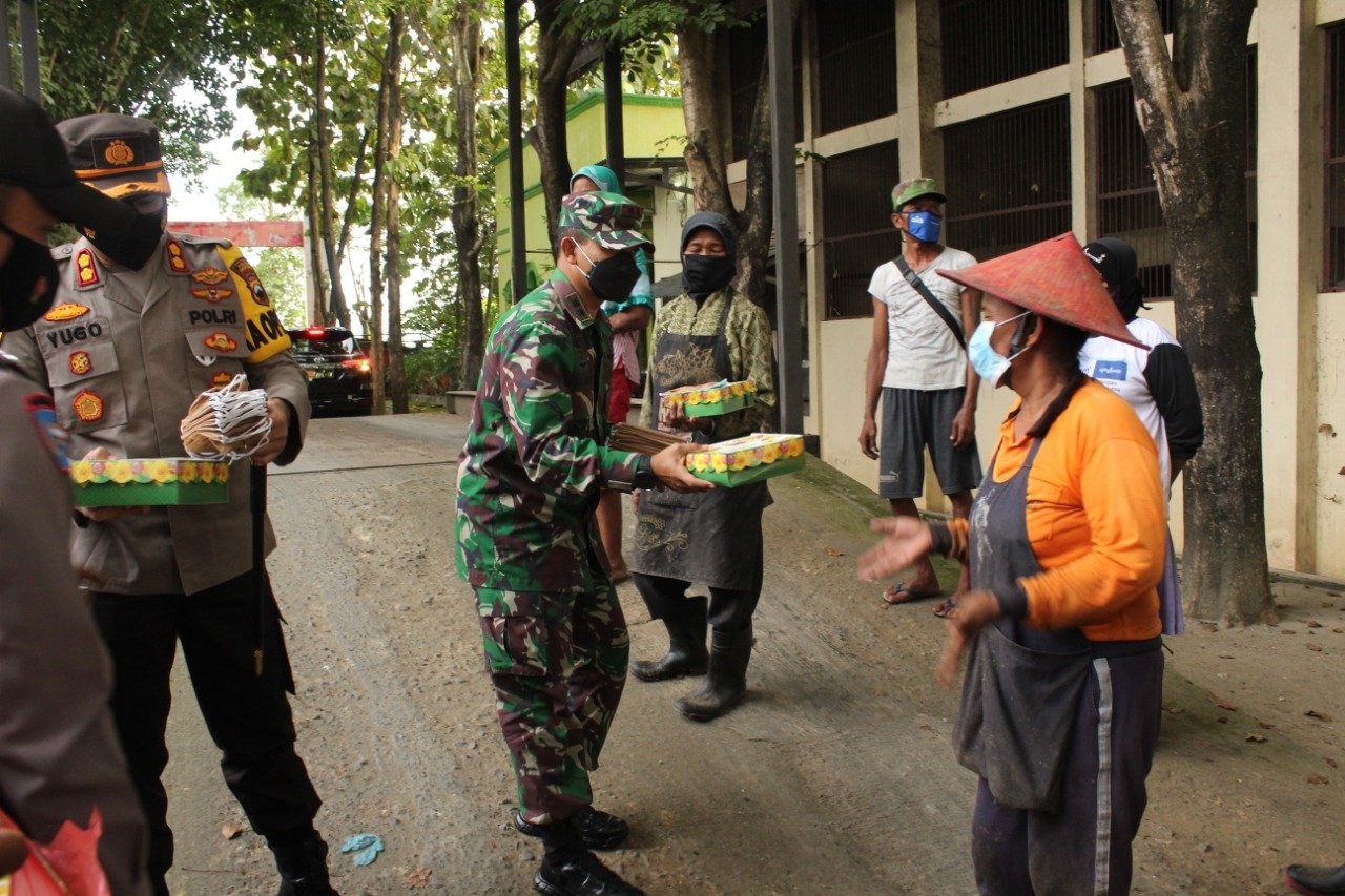 Sukoharjo – Dandim 0726/Sukoharjo Letkol Inf Agus Adhy Darmawan, S.I.P., M.I.Pol dan Kapolres AKBP Bambang Yugo Pamungkas, S.H.,S.I.K.,M.Si bersama Danramil dan Kapolsek melaksanakan pembagian paket nasi kotak serta takjil kepada para petugas kebersihan dan pemulung sampah di TPA Desa Mojorejo Kec. Bendosari.