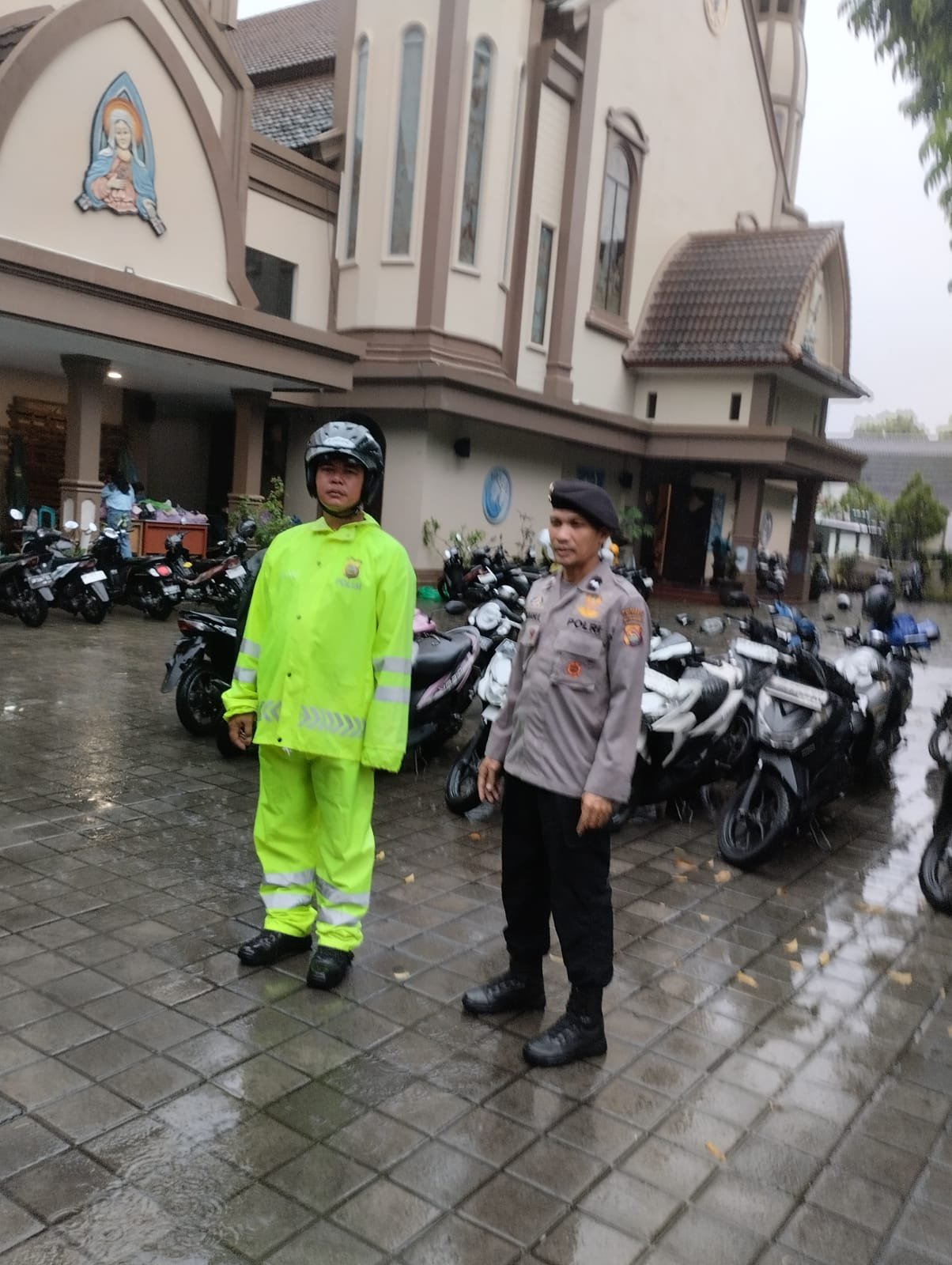 Selain berjaga di pintu masuk gereja, petugas juga melakukan pengaturan arus lalu lintas untuk membantu jemaat yang datang agar tetap nyaman dan tertib, terutama saat kondisi jalan licin akibat hujan deras.