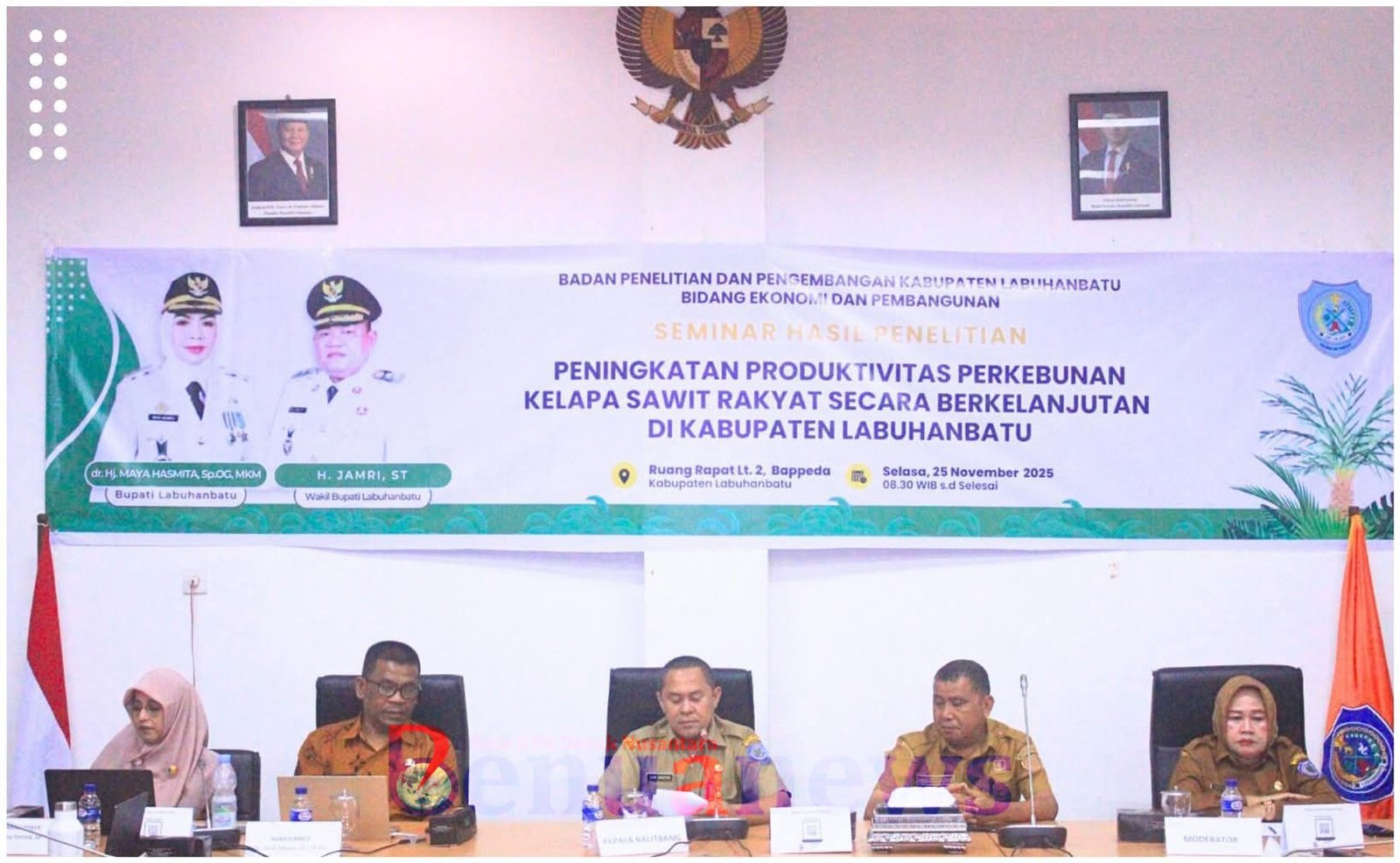 BENUANEWS.COM | Labuhanbatu – Pemerintah Kabupaten Labuhanbatu melalui dinas pertanian bersama tim peneliti dari lembaga akademik menggelar Seminar Hasil Penelitian “Peningkatan Produktivitas Perkebunan Kelapa Sawit Rakyat Secara Berkelanjutan di Kabupaten Labuhanbatu”, Selasa (25/11/2025).