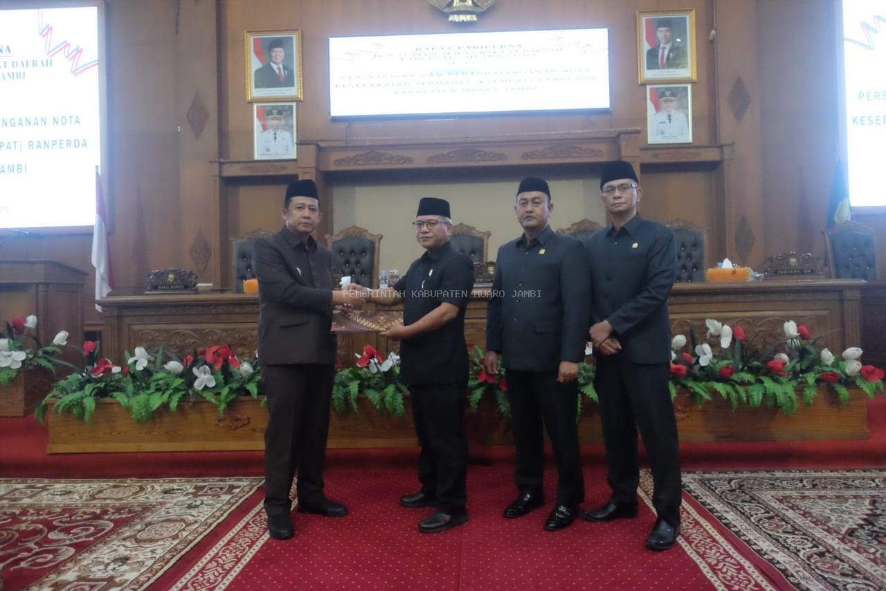 MUARO JAMBI (Benuanews.com)– Dewan Perwakilan Rakyat Daerah (DPRD) Kabupaten Muaro Jambi menggelar Rapat Paripurna dengan agenda Persetujuan dan Penandatanganan Nota Kesepakatan terhadap 5 (lima) Rancangan Peraturan Daerah (Ranperda). Rapat dilaksanakan di Ruang Rapat Utama DPRD Kabupaten Muaro Jambi dan dipimpin langsung oleh Ketua DPRD, Aidi Hatta, Jumat (14/11/2025).