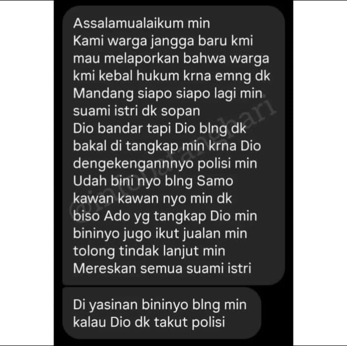“Assalamualaikum min, kami warga Jangga Baru mau melaporkan bahwa warga kami kebal hukum. Suami istri itu diduga bandar sabu, tapi dia bilang tidak akan ditangkap karena dekat dengan polisi. Istrinya juga ikut menjual. Tolong tindak lanjut min, resahkan semua warga. Di pengajian yasinan pun istrinya bilang tidak takut polisi.”