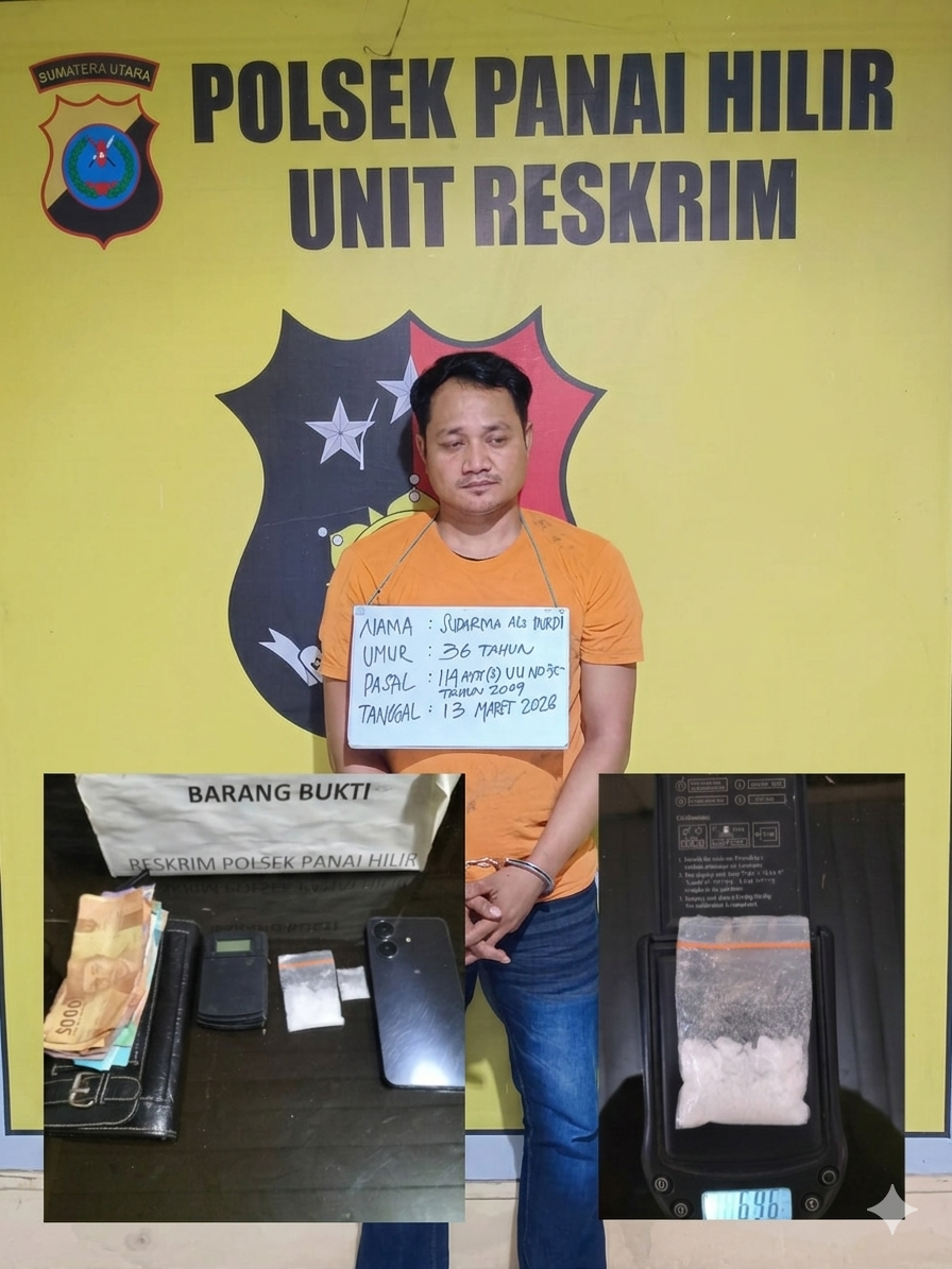 LABUHANBATU | BENUANEWS.COM – Komitmen Kapolsek Panai Hilir, IPTU Yuna Hendrawan Gultom, S.H., M.H., dalam menyikat habis peredaran narkoba di wilayah hukumnya kembali membuahkan hasil nyata. Di bawah komando langsungnya, Unit Reskrim Polsek Panai Hilir berhasil meringkus seorang terduga bandar sabu berinisial S alias Durdi (36) pada Jumat malam (13/03/2026).