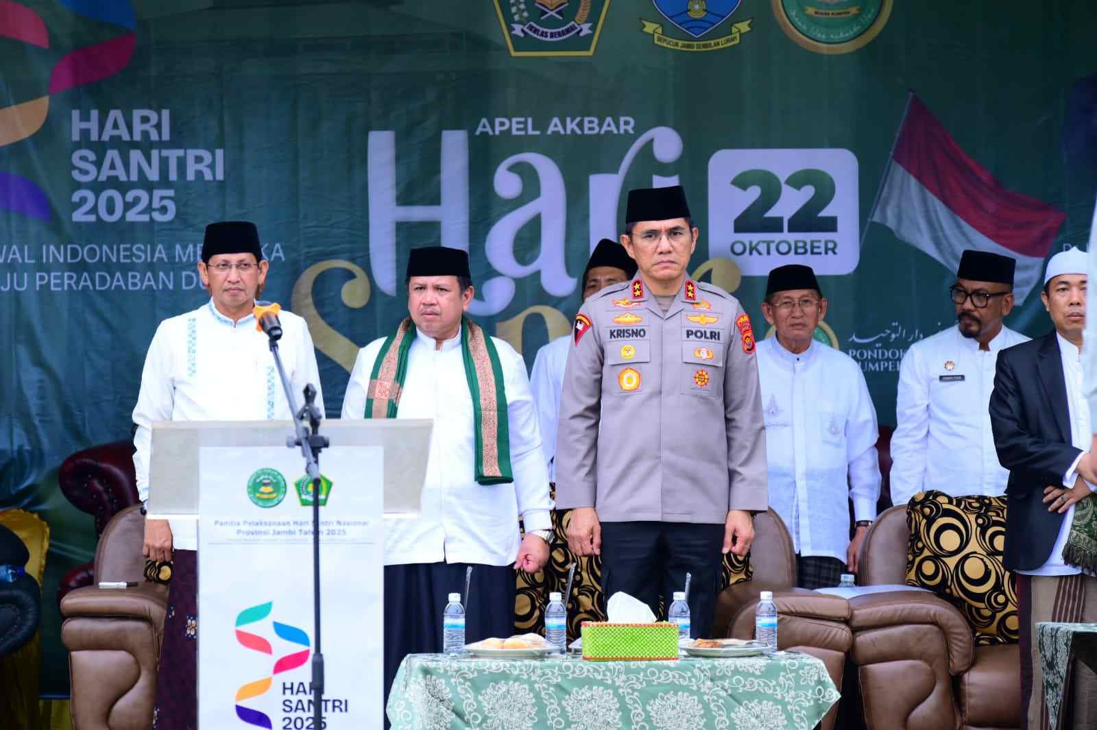Kapolda Jambi Irjen Pol. Krisno H. Siregar menyampaikan apresiasinya terhadap pelaksanaan Apel Akbar Hari Santri Nasional. Menurutnya, kegiatan ini tidak hanya menjadi ajang refleksi sejarah, tetapi juga memperkuat sinergi antara pesantren dan aparat keamanan dalam menjaga kedamaian serta persatuan bangsa.