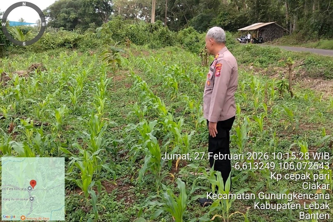 Lebak Benuanews.com Dalam rangka mendukung program ketahanan pangan nasional, Bhabinkamtibmas Polsek Gunungkencana Polres Lebak AKP Supar S. H., dan Bhabinkamtibmas melaksanakan kegiatan monitoring dan pengecekan pertumbuhan tanaman jagung hibrida di Kampung Cepak Pari, Desa Ciakar, Kecamatan Gunungkencana, Kabupaten Lebak, Provinsi Banten, Jum’at (27/02/2026)