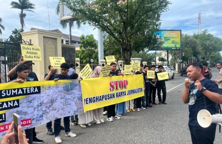 BANDA ACEH-Benuanews.com-Koalisi masyarakat sipil bersama mahasiswa menggelar aksi damai di halaman Dewan Perwakilan Rakyat Aceh (DPRA), Banda Aceh, Selasa (16/12/2025). Mereka mendesak pemerintah pusat menetapkan bencana banjir dan tanah longsor yang melanda Aceh, Sumatera Utara, dan Sumatera Barat sebagai Bencana Nasional, menyusul dampak kemanusiaan lintas provinsi yang dinilai telah melampaui kemampuan pemerintah daerah.