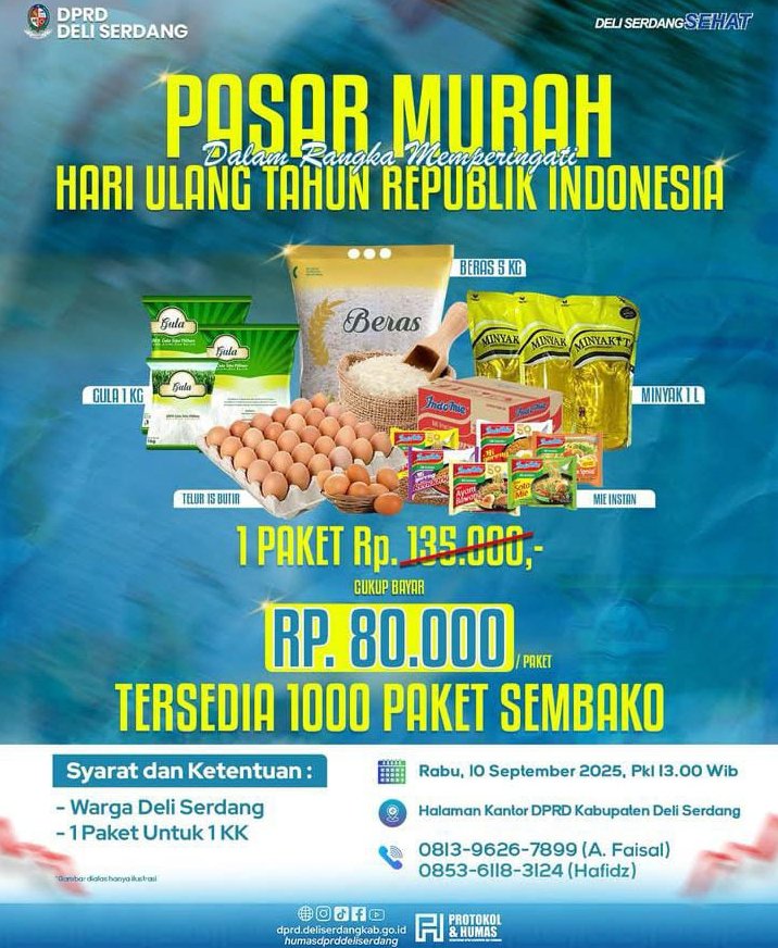 Pasalnya Beredar Vidio di media sosial , terkait pasar murah yg di laksanakan Ketua DPRD Kabupaten Deliserdang dan Para Anggota DPRD , dengan harga 1 paket sembako Rp.80.000- dengan isi 1 sak beras SPHP/Bulog 5 kilogram, minyak makan 1 kilogram, beberapa biji supermi dan telur