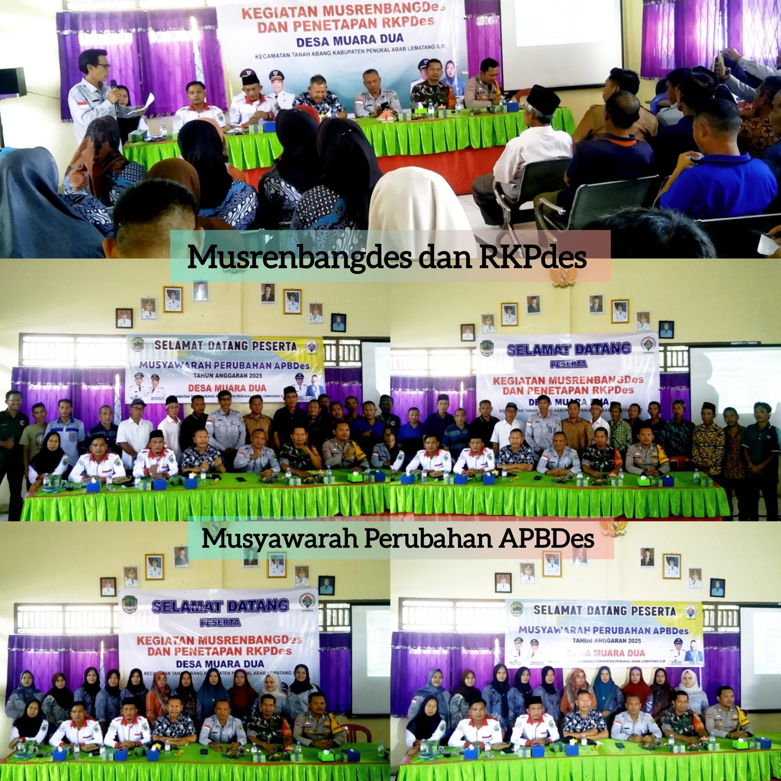 Musrenbangdes dan RKPDes serta Musyawarah Perubahan, Penetapan perencanaan pembangunan desa Muara Dua ini dihadiri oleh, Dadang Afriandy SH. M,Si. Camat kecamatan Tanah Abang, Sekretaris Camat (SEKCAM) kecamatan Tanah Abang Darmawan SH, Kepala desa Muara Dua, Winsa Obeni SH, Ketua BPD Hidayat Saputra SE, dan anggotanya, ketua TP-PKK desa Muara Dua, Leni Marlina, Babinsa Samiran, Babinkamtibmas, Beni Arshal, Ketua LPMD, Kanto Ernedi, Perangkat desa Muara Dua, LINMAS, Bidan desa Muara Dua, Nani Angaraini, Serta tokoh masyarakat desa Muara Dua,
