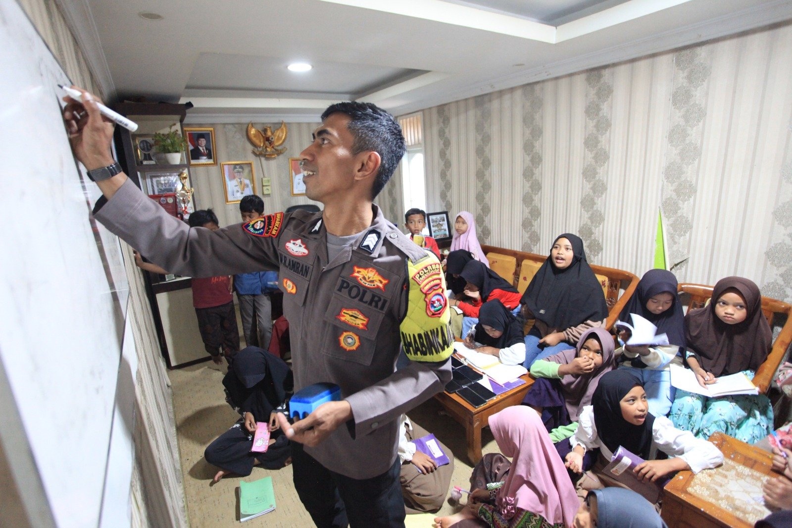 Dialah Brigadir Wedi Rahmad Amran, Bhabinkamtibmas yang dikenal warga dengan sapaan “Pak Babin.” Ia bukan sedang patroli, melainkan mengajar — mengubah seragamnya menjadi simbol kasih dan harapan bagi anak-anak desa di kaki Gunung Marapi.