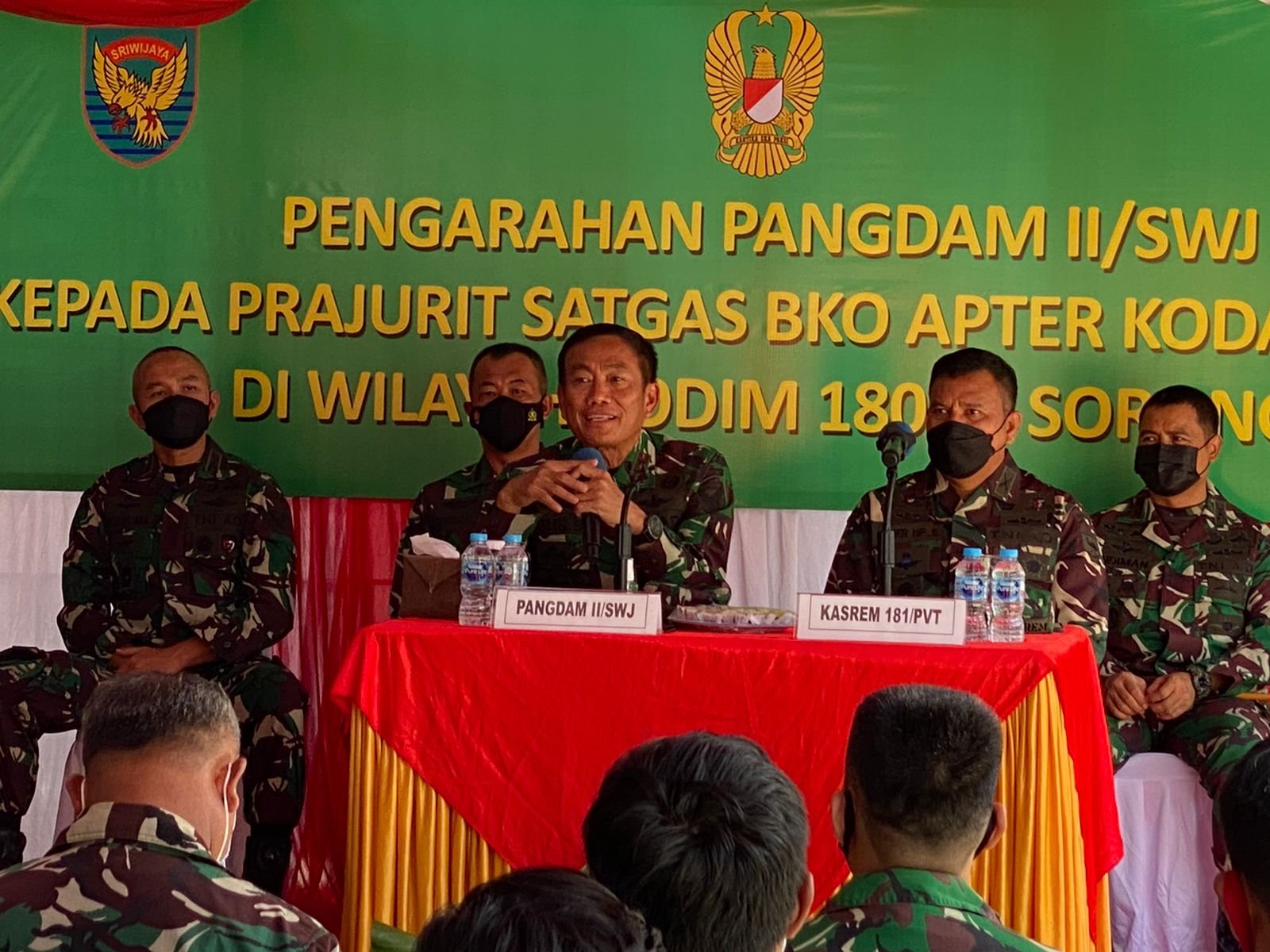 Dalam arahannya, Pangdam II/Swj Mayjen TNI Agus Suhardi menjelaskan bahwa, tugas sebagai Satgas BKO Aparat Teritorial Koramil Persiapan merupakan tugas mulia, tugas negara yang tidak ringan dan penuh tantangan. “Oleh sebab itu, laksanakan tugas dengan tulus dan ikhlas”, kata Pangdam.