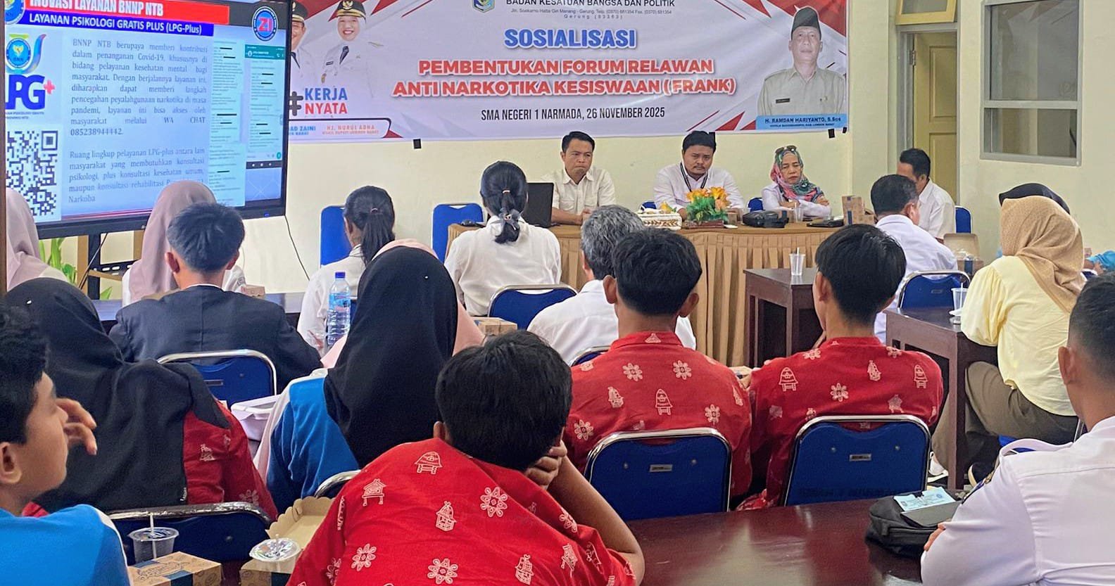 Mataram NTB benuanews.com – Upaya pencegahan dini terhadap penyalahgunaan narkoba terus digencarkan Polresta Mataram. Rabu (26/11/2025), personel Satuan Reserse Narkoba Polresta Mataram hadir sekaligus menjadi narasumber dalam kegiatan sosialisasi bahaya narkoba yang dirangkaikan dengan pembentukan Forum Relawan Anti Narkoba Kesiswaan (FRANK) di SMAN 1 Narmada.