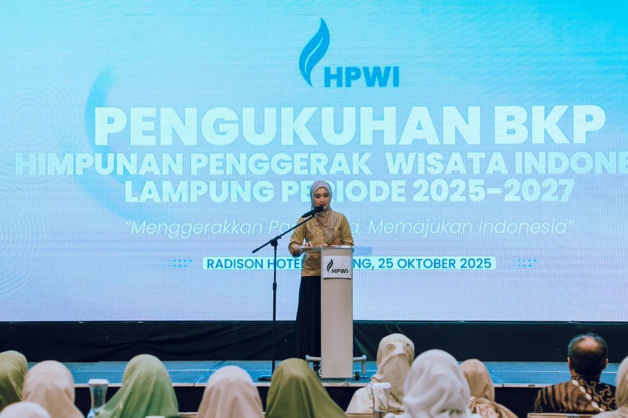 Bandar Lampung, Benuanews.com – Wakil Gubernur Lampung, Jihan Nurlela menghadiri Pengukuhan Badan Koordinasi Provinsi (BKP) Himpunan Penggerak Wisata Indonesia (HPWI) Lampung Periode 2025-2027 bertempat di Ballroom Hotel Radisson, Sabtu (25/10/2025).