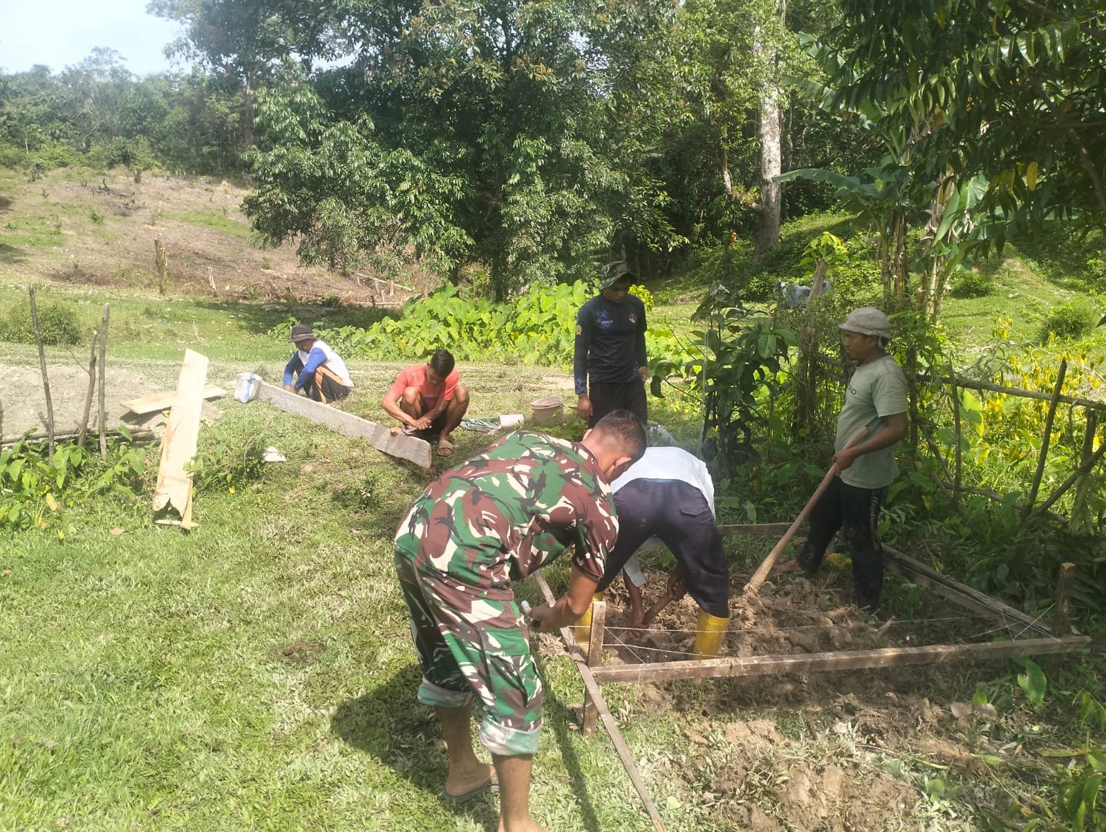 Personel Satgas TMMD bersama warga setempat bergotong royong menyiapkan material bangunan dan melakukan penggalian di lokasi yang telah ditentukan.