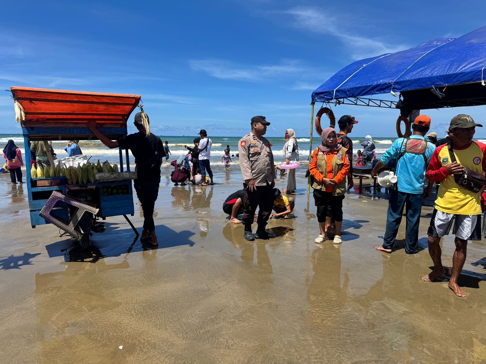 Selama patroli, anggota Pos Pam memberikan imbauan kepada para wisatawan untuk senantiasa berhati-hati, menjaga barang bawaan, dan memastikan keselamatan anggota keluarganya, terutama anak-anak yang bermain di area pantai agar tidak berenang terlalu tengah.