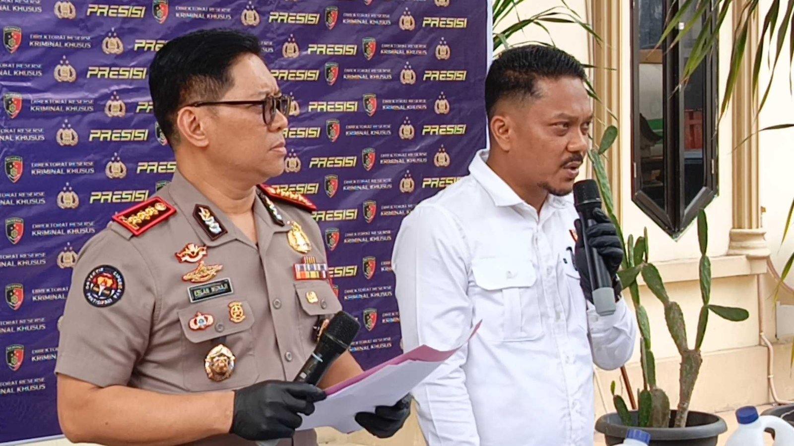 Kabid Humas Polda Jambi Kombes Pol Erlan Munaji didampingi Kasubdit IV Tipidter Ditreskrimsus Polda Jambi AKBP Hadi Handoko saat konferensi pers di Mapolda Jambi, Senin (9/2/2026).