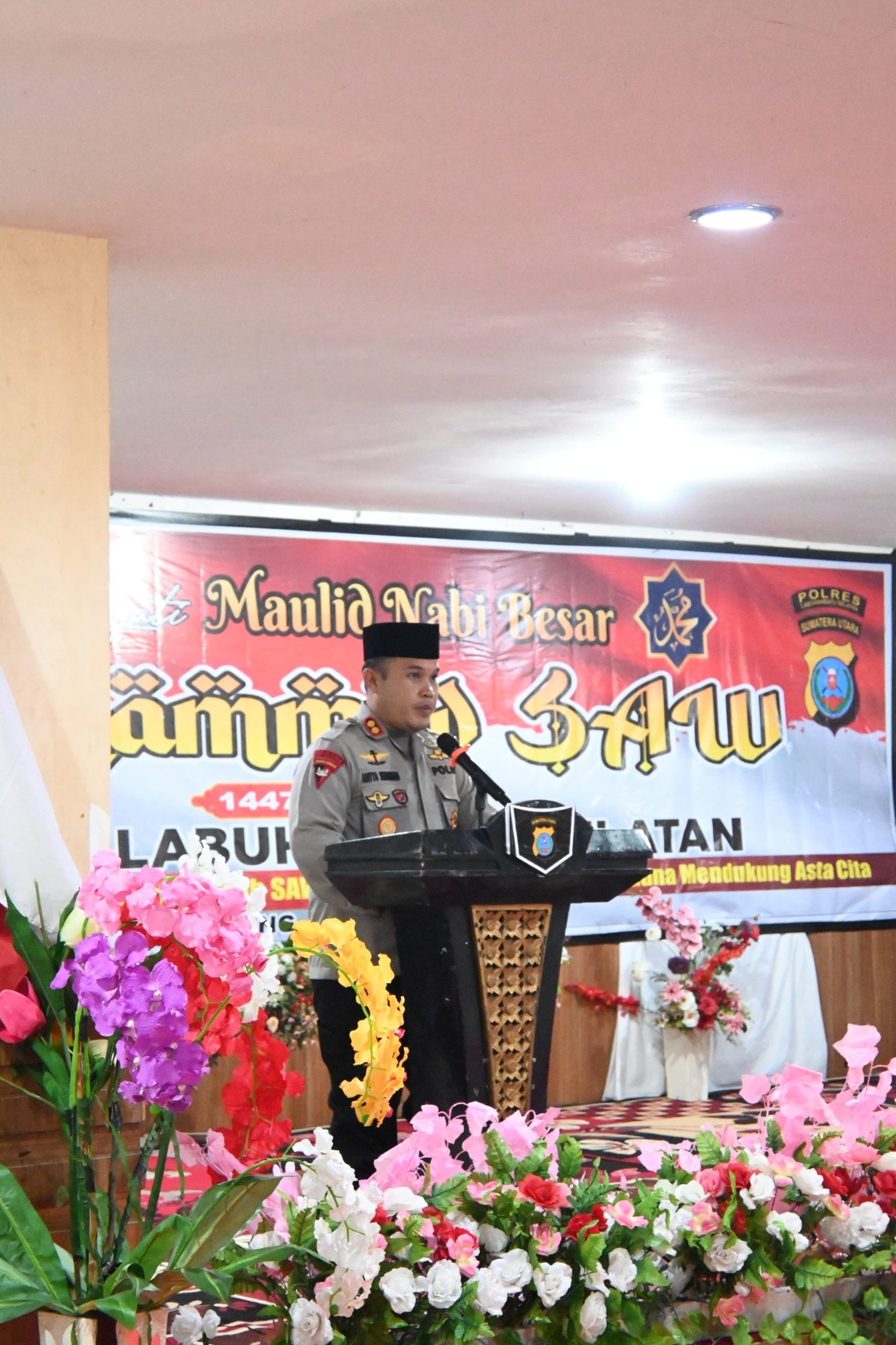 Sementara itu, dalam sambutannya, Kapolres Labuhanbatu Selatan AKBP Aditya S.P. Sembiring Muham, S.I.K. menyampaikan bahwa peringatan Maulid Nabi Muhammad SAW menjadi momentum penting untuk memperkuat iman dan meneladani akhlak Rasulullah dalam kehidupan sehari-hari.