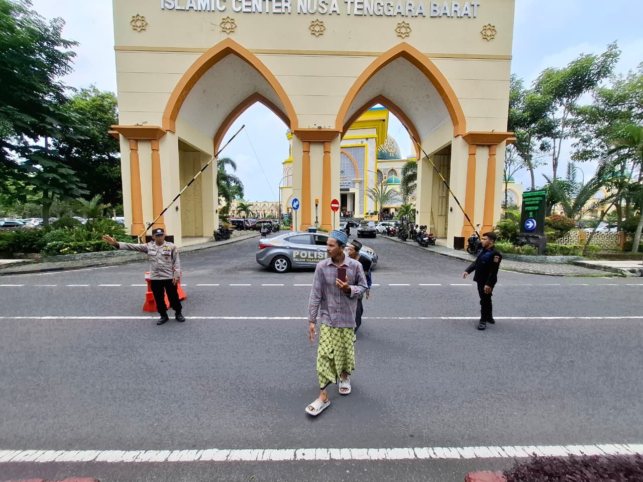Pantauan di Masjid Hubbul Wathan Islamic Center Mataram, sejumlah personel tampak sigap mengatur arus lalu lintas di sekitar masjid. Pengaturan dilakukan untuk memberi ruang aman bagi jamaah yang hendak masuk dan keluar area ibadah, sekaligus menjaga kelancaran lalu lintas di jalan umum yang padat kendaraan.