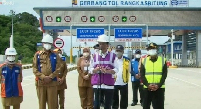 Lebak Banten Benuanews.com Dalam rangka Kunjungan Bapak Presiden Jokowi ke Kabupaten Lebak provinsi Banten bersama rombongan langsung menuju pintu tol Rangkasbitug dengan di dampingi oleh Gubernur Banten dan Kapolda Banten beserta jajaran tim pengamana n yang ketat oleh Paspampres peresmian jalan tol Serang-panimbang oleh Presiden Jokowi Widodo dan uji coba jalan tol tepatnya di pintu tol Rangkasbitung.senin(16/11/21)