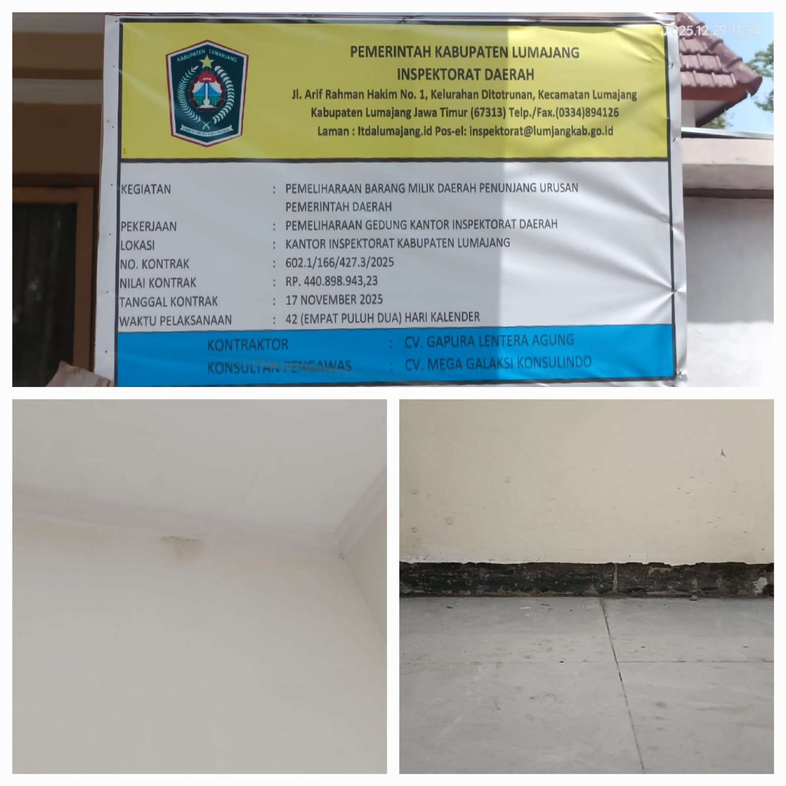 Lumajang,Benua News.com – Proyek pemeliharaan Gedung Kantor Inspektorat Daerah Kabupaten Lumajang dengan nilai kontrak Rp440.898.943,23 yang dikerjakan CV Gapura Lentera Agung sejak 17 November 2025 (durasi 42 hari kalender) menuai sorotan. Meskipun pihak pelaksana mengklaim pekerjaan “sudah selesai”, pantauan pada 29 Desember 2025 menunjukkan kondisi sebaliknya.