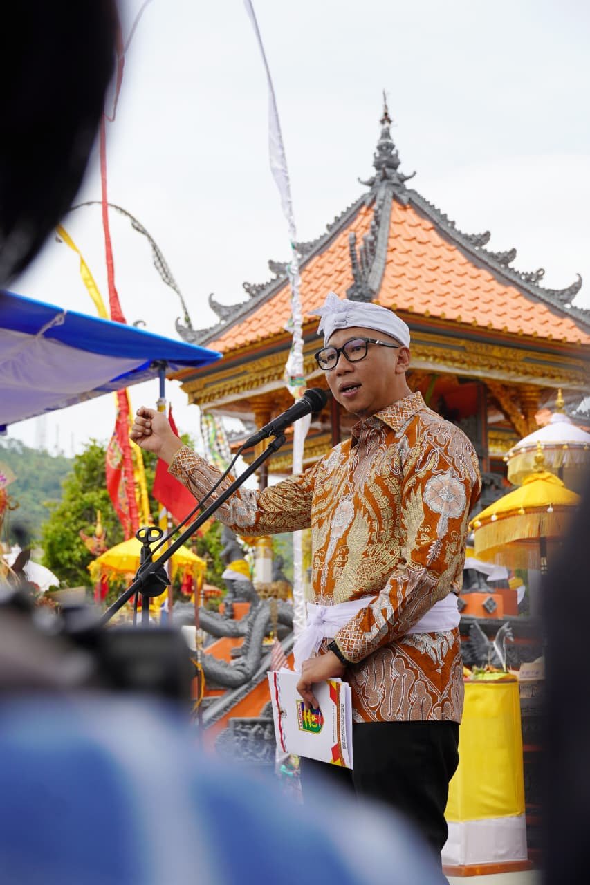 Gubernur mengawali sambutannya dengan rasa syukur dan permohonan maaf karena baru dapat memenuhi undangan umat Hindu sejak ia dilantik sebagai Gubernur. Ia menegaskan bahwa kunjungannya bukan sekadar memenuhi agenda seremonial, tetapi merupakan bentuk komitmen pemerintah daerah untuk berjalan beriringan dengan umat Sedharma.