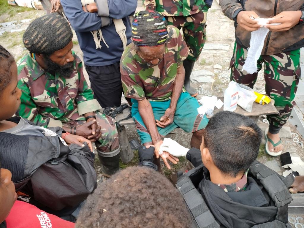 Peduli Kesehatan Masyarakat Satgas satuan organik Yonif Raider 321/GT dengan sigap memberikan pengobatan dan pelayanan kesehatan kepada masyarakat Distrik Dal Kabupaten Nduga, Provinsi Papua, Sabtu (09/07/2022)