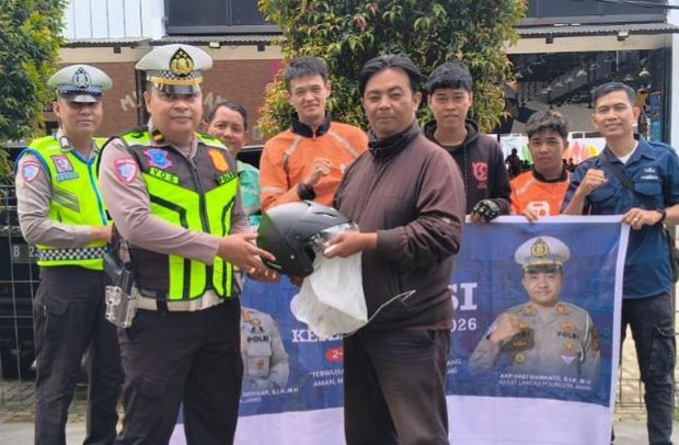 Kegiatan tersebut diisi dengan edukasi keselamatan berlalu lintas, sosialisasi Operasi Keselamatan 2026, serta pemasangan stiker dan spanduk imbauan tertib berlalu lintas kepada masyarakat.