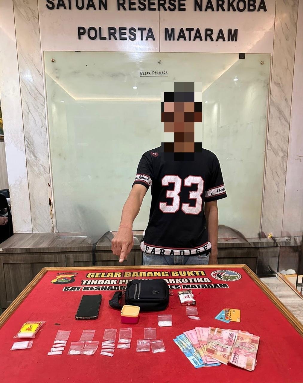 Terduga berinisial SH (35), warga Kecamatan Mataram, diamankan saat berada di salah satu gang di Jalan Abdul Kadir Munsi, Kelurahan Punie, Kecamatan Mataram. Saat penangkapan, SH diduga tengah berdiri di pinggir gang dan dicurigai sedang menunggu pembeli.