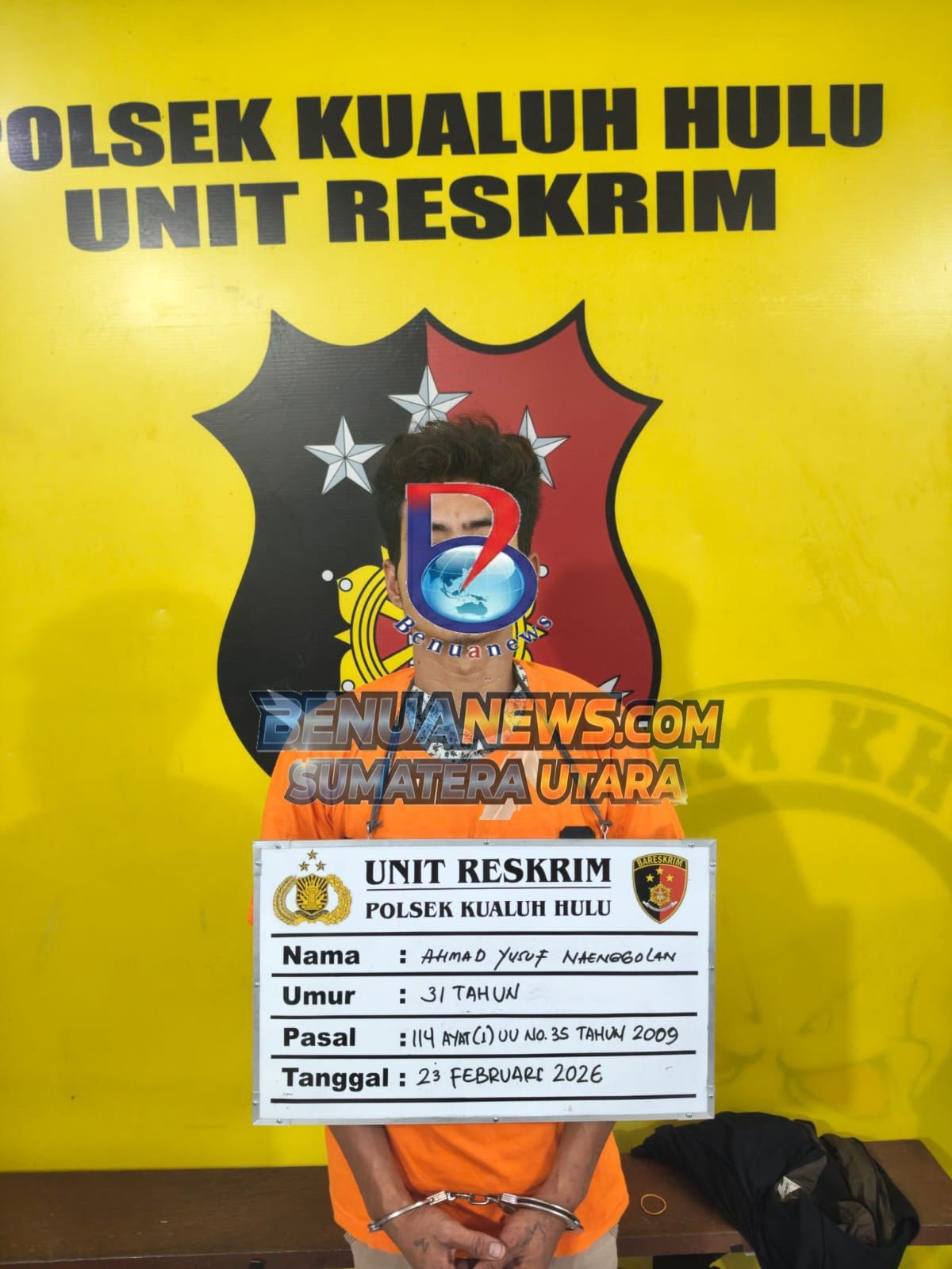 Tersangka Ahmad Yusup Nainggolan kini telah digelandang ke Mapolsek Kualuh Hulu untuk menjalani pemeriksaan intensif. Atas perbuatannya, tersangka terancam dijerat dengan UU No. 35 Tahun 2009 tentang Narkotika (atau merujuk pada KUHP Baru UU No. 1/2023 terkait tindak pidana narkotika) dengan ancaman hukuman penjara yang berat.