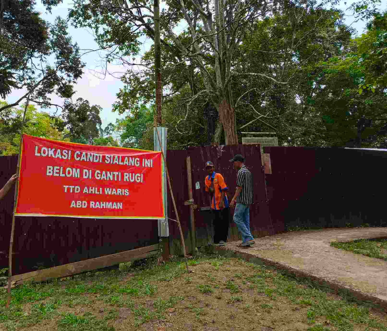Tak tinggal diam, Rahman pun memasang plang tandingan bertuliskan “Lokasi Candi Sialang Ini Belom Di Ganti Rugi” sebagai bentuk protes dan penegasan bahwa status kepemilikan lahan belum tuntas secara hukum maupun administratif.