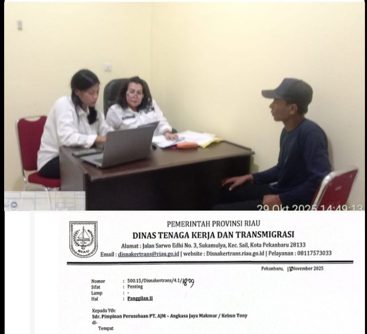 Kepala Dinas Transnaker Provinsi Riau, saat dikonfirmasi melalui pesan WhatsApp, membenarkan bahwa pihaknya telah menerima laporan tersebut dan sedang mengambil langkah tindak lanjut.Telah kita kirim surat panggilan ke II kepada pihak perusahaan untuk dimintai keterangan