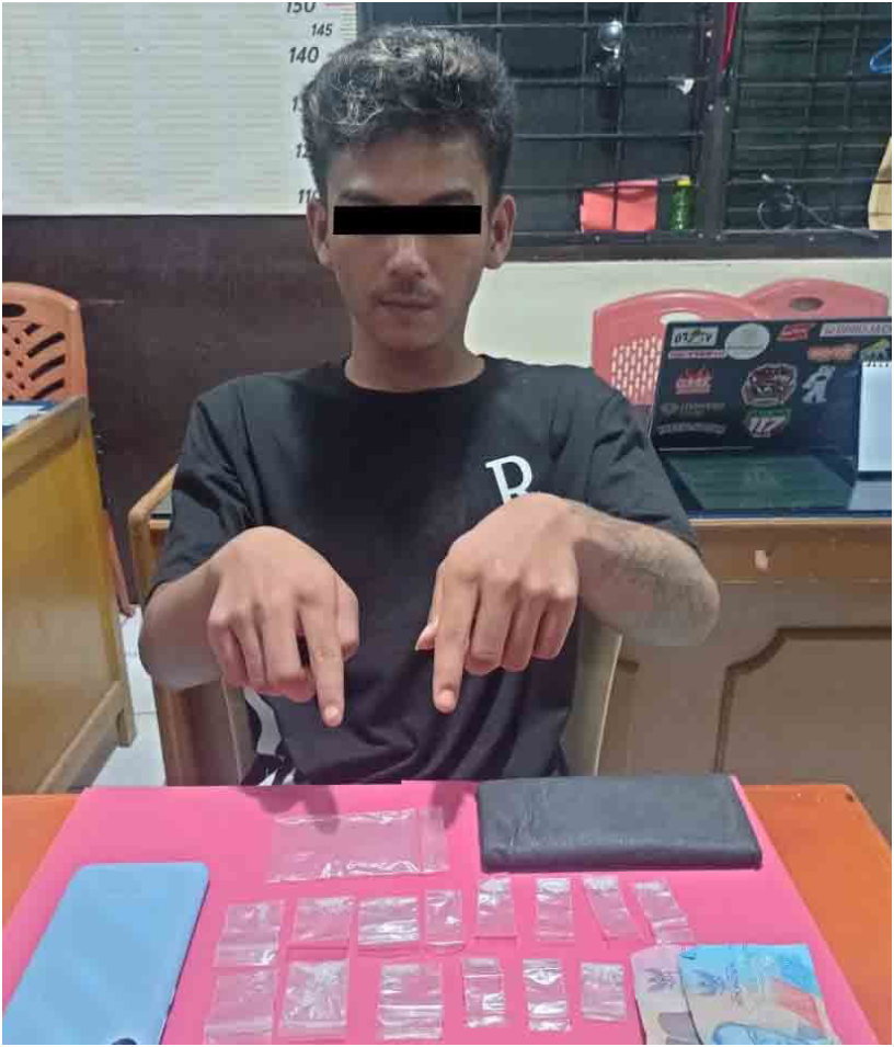 Saat penyergapan dan penggeledahan, belasan paket narkotika tersebut ditemukan aparat kepolisian didalam dompet warna hitam yang berada pada kantong celana terssangka.