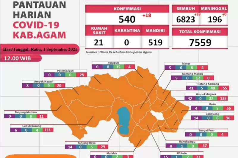 Lubuk Basung (benuanews.com) – Dinas Kesehatan Kabupaten Agam, Sumatera Barat mencatat 6.823 orang pasien positif COVID-19 di daerah itu telah sembuh hingga Selasa (31/8).